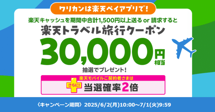 楽天ペイで残高を請求または送付することで、トラベルクーポンが当たるこのキャンペーンは、旅行好きの方にとって嬉しいチャンスです。特に、楽天モバイル契約者は当選確率が2倍になるので、ぜひこの機会に楽天ペイを活用して楽しい旅行の準備をしてみてください。