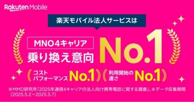 楽天モバイルは、2025年通信4キャリアの法人向け携帯電話に関する調査で、乗り換え検討先として1位を獲得しました。この調査では、法人向け携帯電話サービスの満足度が評価され、楽天モバイルは「コストパフォーマンス」と「利用開始までの速さ」で特に高い評価を得ています。