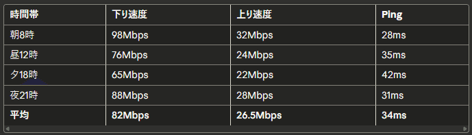 時間帯下り速度上り速度Ping朝8時98Mbps32Mbps28ms昼12時76Mbps24Mbps35ms夕18時65Mbps22Mbps42ms夜21時88Mbps28Mbps31ms平均82Mbps26.5Mbps34ms